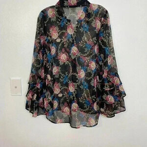 Seven7 Floral Black Ruffle Sheer Button Down Blouse