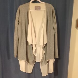Stylish open front cardigan. Perfect for layering. Soft gray sweatshirt material and white sheer under layer. designed by Melissa McCarthy.