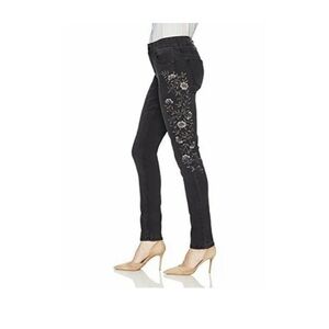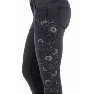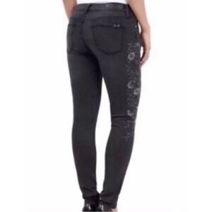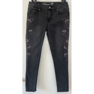 Seven7 jeans Perses black ( faded black wash ) denim jeanss with side embroidered floral design. Front button & zipper closure with belt loops. High rise, skinny fit. Seven7 Jeans logo patch at back waistband & at back pocket.
