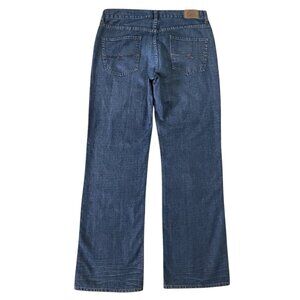 These lightly distressed casual medium wash denim jeans feature 5 pocket styling, zip fly with button closure, and belt loops.