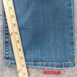 These jeans are medium wash denim with light fading and whiskering for a naturally worn-in look. They feature a slight bootcut silhouette, mid-rise waist, and classic 5-pocket styling. The material blend with stretch provides a comfortable, flattering fit that moves with the body ideal for casual or everyday wear.
