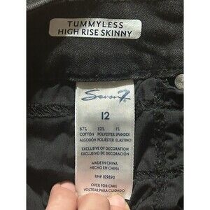 Womens Seven7 Jeans in the Tummyless High Rise Skinny style. Size 12. Black stretch denim with slimming tummy-control panel. Skinny leg, high rise, classic 5-pocket style. 67% cotton, 32% polyester, 1% spandex. Pre-owned, good condition.