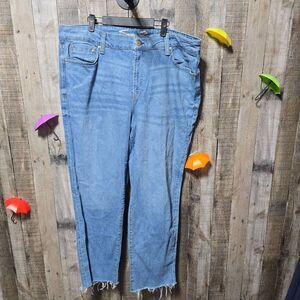 Details: high waisted, light wash, some stretch, zip and button closure, factory raw hems