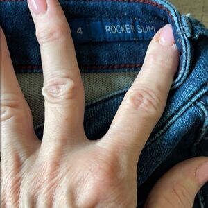 Features: Five pocket styling on these medium to dark wash boot cut jeans. No distressing other than typical color fade.
