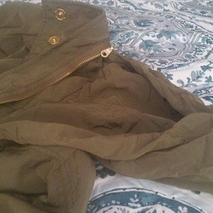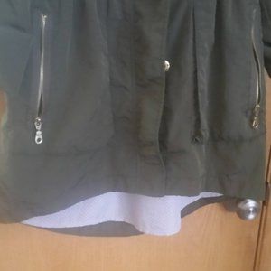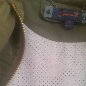 Seven7 Rain Jacket. Olive green nylon outer shell. Gold zipper front, pockets & snap closures. Sleeves roll up and snap in place. Vented back w/polyester stay dry liner. Hood zips into the collar. Elastic waist measures 16" across. Front length is 31" from shoulder to hem, back is 33" shoulder to hem. I loved this jacket so much I bought two- one in taupe and this one in green. I've only worn this one a couple of times, so I decided to let it go. Excellent condition.Great all year round.