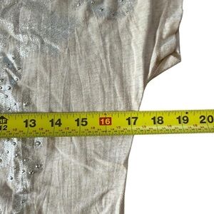 Lightweight gray tee from Seven7 featuring a silver metallic graphic with rhinestone accents. V-neck cut with cap sleeves. Soft and semi-sheer, perfect for layering or a casual glam look. Approx. 19” pit to pit, 28” length.
