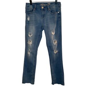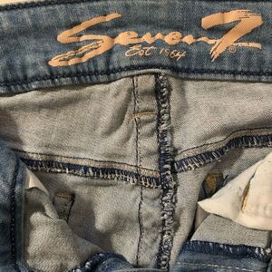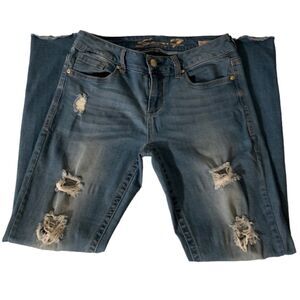 Seven7 slim straight jeans in size 8. These blue distressed denim jeans are gently used and in good condition. They feature a raw hem and are made from 98% cotton and 2% spandex.