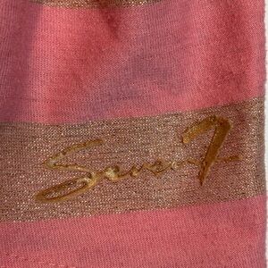 Coral pink with metallic gold stripes, drapey cowl neckline