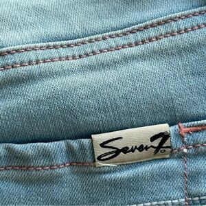 Seven7 Weekend Denim Shorts, Women’s Size 10, Icy2 Blue, Rainbow Side Stripes, Raw Hem, Stretch Denim, Light Wash, High Rise, Casual Shorts, 67% Cotton, 5” Inseam, Summer Style, Comfortable Fit, Pre-Owned, Excellent Condition