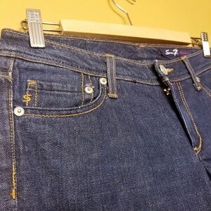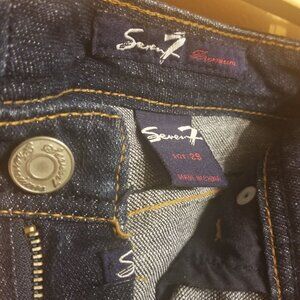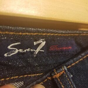 Classic dark wash, high rise, bootcut or flared jeans by Seven7, size 29. Gold trim and gold label. Excellent pre-owned condition overall; slight wear on bottom hems and slight distress on front of jeans and back pockets.