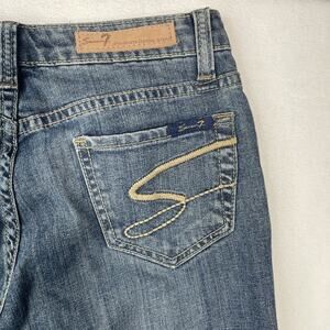 The product is a pair of Seven7 Women's High Rise Slim Straight Jeans in size 4, with a light wash and a denim fabric type. These jeans feature a mid-rise waist and a 5-pocket design, with a zip closure and accents of stretch. The jeans are designed to be slim and straight, with features that include a booty shaper, stretch material, and a lift effect. They are machine washable and suitable for all seasons of the year. Made with a cotton blend material, these jeans are part of the Seven7 product line and are a stylish and versatile addition to any woman's wardrobe.