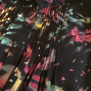 Seven7 by Melissa McCarthy Blouse 2x. Black Multi color v-neck with button down and pleating under the bust. 3/4 sleeve with elastic at cuff and tie at waist.