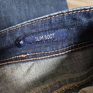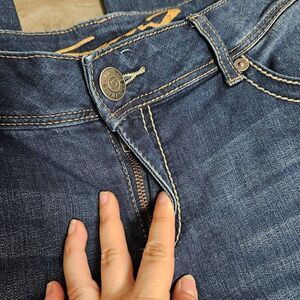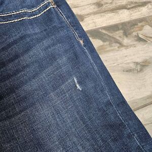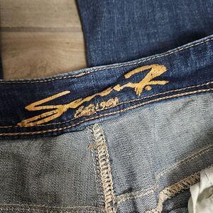 This is a pair of slim boot cut jeans by Seven7. They have light distressing and whiskering details as shown in the photos.