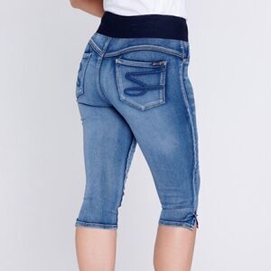 Handcrafted from premium stretch denim, this high-rise skimmer jean boasts exceptional comfort and a sleek knee-length silhouette. The pull-on pair sculpts the silhouette with a wide waistband and a curved back yoke that does wonders for the derrière.