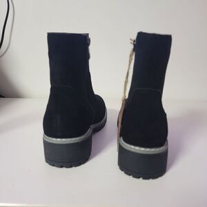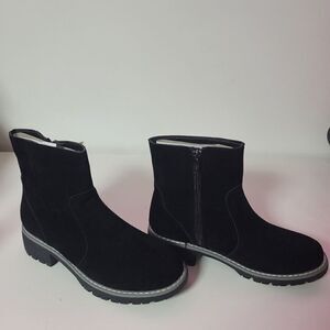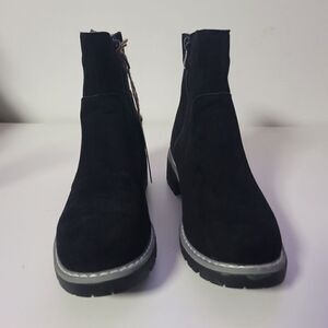 The Bestie mid calf lug-sole boot features a memory foam footbed on a TPR outsole with a side zip closure. Finished in a lush microsuede upper.