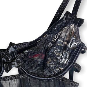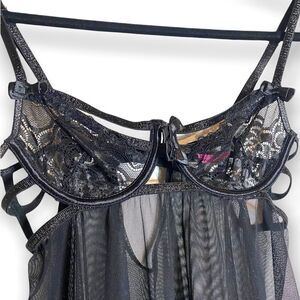 This babydoll has black lace lined cups with a built in underwire. Sides of the bust have three strappy & stretchy bands for embellishment. Single hook closure on the back, the bodice of this piece is sheer and the bottom hemline is lined with matching lace to the bust. Great condition and only worn a handful of times, this babydoll has no flaws to note and lots of life left.