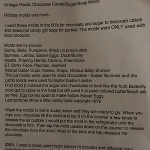 Vintage Plastic Chocolate Candy/Sugar Molds were mine and used by me in the 80’s. Some were used for chocolates and some were used for sugars. The butterfly mold is damaged on the corner-look at picture. Some of the molds I used to paint with chocolate that I colored. Some I used to mold sugar to decorate cakes. The lambs I used for butter at Easter time. The candy book was copyright 1976. This was a fun hobby.