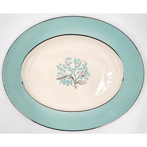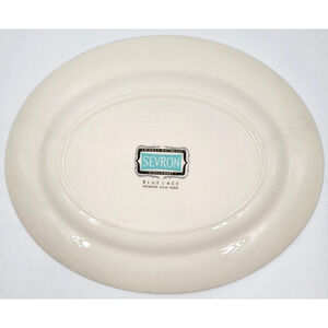 The Sevron Blue Lace 9" Serving Platter with Platinum Silver Trim from the 1950's is a vintage bone china piece that exudes elegance and charm. The oval shape, lace pattern, and blue color make it a stunning addition to any table setting. With its Mid-Century Modern style and glossy finish, this original platter showcases a beautiful flower theme that adds a touch of sophistication to your decor. Made in the United States, this piece is not only stylish but also durable, weighing 11.5 oz. Perfect for serving up your favorite dishes in style.