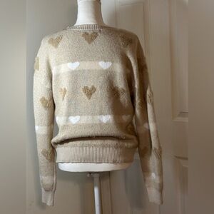 This beautiful Sew In Love sweater in the color of tan featuring different heart prints and pearl details on both front and back can be worn dressed up or with a pair of jeans and booties! Very cute design on this sweater. She is a size medium. Her measurements and materials are shown in the pictures. Very soft sweater!!!