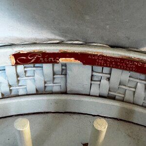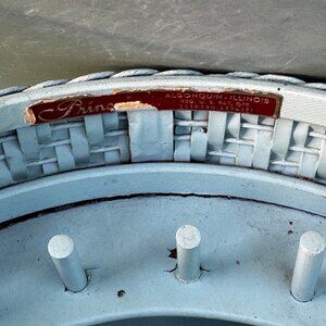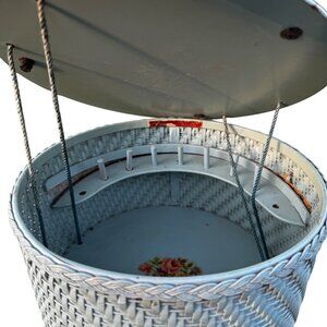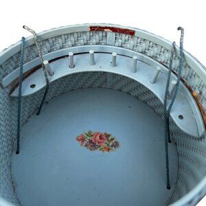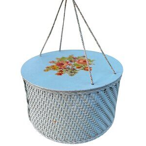 This charming vintage 1940s sewing basket features a floral lid design and was crafted in Algonquin, Illinois. A timeless piece for any sewing enthusiast or vintage collector.