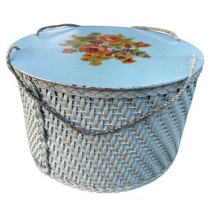 vintage sewing, 1940s basket, floral sewing box, Algonquin Illinois, MCM sewing, retro sewing, sewing storage, vintage decor, collectible basket, mid-century, sewing supplies, floral lid, vintage craft