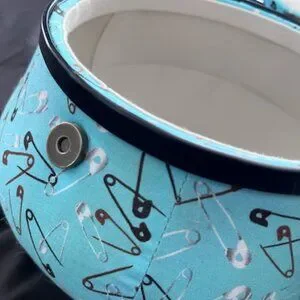Teal with black and white clothespins pattern. Black handle.