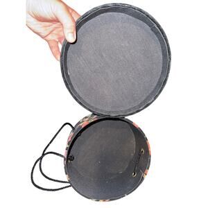 Small Black Velvet & Floral Pinwale Sewing Hat-Box Purse with Roses and Pincushion-Hat Lid and Black Cord Handle. Minor signs of wear. Measures 6" high to top of hat and 7" across bottom with a 6" strap drop. Unlabeled.