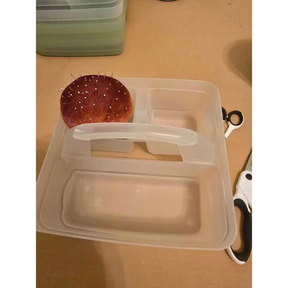 This is a sewing kit set that includes: carrying box, pin holder, scissors (as shown), measuring tape and small trash for sewing table (I have 5 of these)