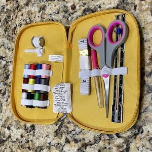 Colorful pouch with floral design. Comes complete with all the tools needed to mend things on the go.