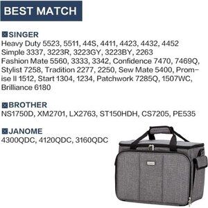 🧿GENEROUS STORAGE SPACE: Storing machines up to 17 x 8 x 12 inches. Spacey main compartment fits most standard sized sewing machines, compatible with SINGER, Brother and Janome. Reasonable layout design, unique thread spool holders & multiple custom pockets provides roomy space to hold sewing items you may need organizing with. Sturdy see through pockets made it easy to locate the items you are looking for, and protect you from sharp tools