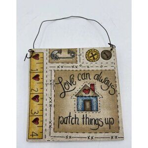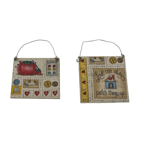 Sewing Room Wall Decor 4 to 5 Inch Square Buttons Hearts Thimble House Farmhouse Lot Of 2 In Very Good Pre-owned Condition. Fabric covered wood plaques with wire hangers. The wire hangers are slightly misshapen and add to the charm of the pieces.