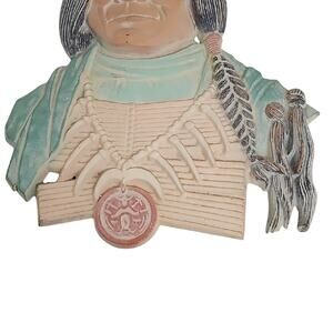 Artistic wall piece depicting a Native American figure with detailed feather accents. Features earthy tones and a hint of teal. This piece is metal and in good preowned condition. Signed Sexton WJ on back this piece is from the 1970's and would be a beautiful addition to any wall. It measures about 13 inches by 9 inches. Grab it today
