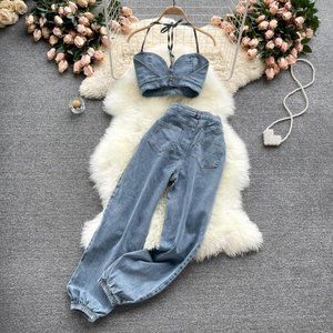 Sexy Backless Denim Sling Top and Long Pants Two Piece Set