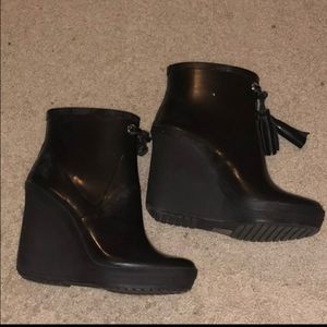 Make rainy days your runway in these sexy black wedge rainboots! Sleek enough for your old money outfits and the tassels add a touch of whimsy