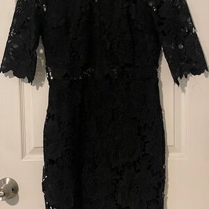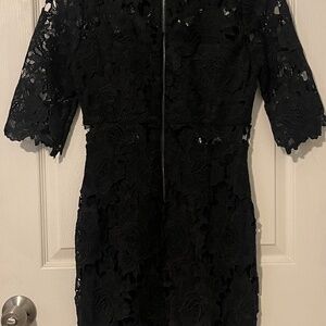 Your new favorite LBD. Black sheath dress with lace overlay. Thin cut-out in the upper midsection adds sexiness with still being classy and feminine. Long lace bell sleeves. Worn once, size medium