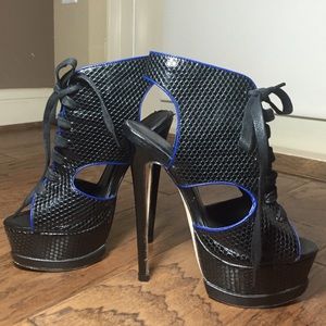 Sexy Black Iridescent Snake Print Pump With Inner Blue Lining & Black Shoe Strings For A Sexy Sporty Look. 6" Heel With 2" Platform So It Feels Like A 4" Heel