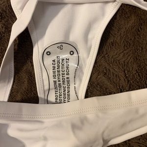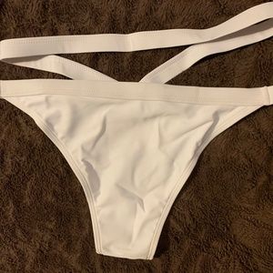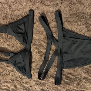 New, never used black strappy bikini set. The bikini top has mesh material with black straps. The bottoms are a cheeky strap.