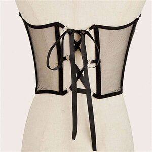 Transform any outfit instantly with this sexy black mesh splice bustier corset featuring chain details. The waist cincher with steel bones accentuates your waist, giving you a stunning, sexy look. Comfortable and adjustable, the lace-up ribbon on the back ensures a perfect fit