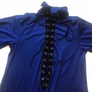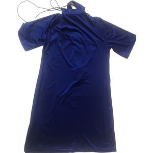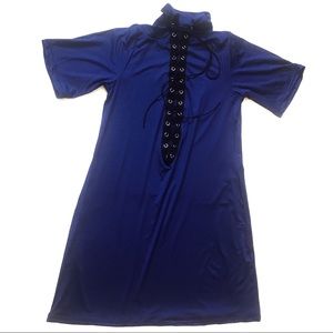 Sexy blue short sleeved polyester mini dress, features v neck tie, size small, brand new.