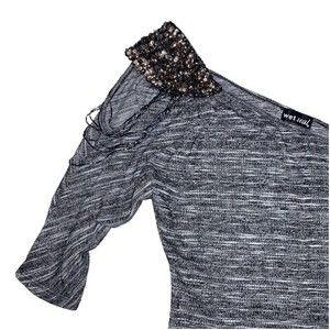 Sexy Cold Shoulder Beaded Gray Space Dye Ruched Asymmetrical Blouse Shirt Top