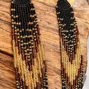 Sexy Dramatic Black and Gold Glass Beaded Fringe Earrings Handmade Almost 9” long These earrings feature intricate glass seed beadwork in striking black and gold hues, showcasing a geometric design on the ends with dramatic fringe. The substantial length and detailed patterns add a touch of sexy movement and draws attention to your collarbone. Just beautiful. Size see picture with US quarter.