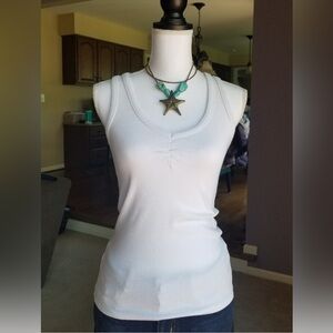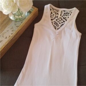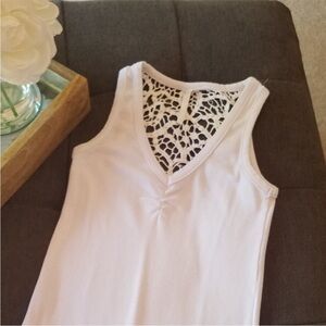 A white ribbed tank top. V-neck. Crochet lace detail in the back.