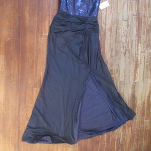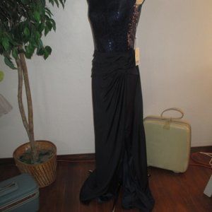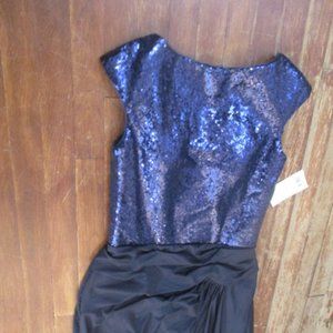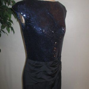 Discounts by bundling. NWT. Navy Blue High slit sexy form fitting elegant dress with sequin bodice. Ruched waist with drop skirt that is a jersey flowing fabric lined with satin. Sleeveless--- Support in the bodice for bust. This is very sophisticated and elegant. Fun and stunning. Military dance elegant. It reminds me of something Carolyn Bessette-Kennedy would wear. Many of these dresses were samples so plan accordingly. This is a custom made size approx. 8-10 but go by measurements. See last picture for approximate measurements.