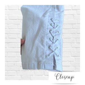 What a great pair of Jennifer Lopez white jeans. They are ankle length with lace up detail at the side seams. Pair them with your favorite T-shirt for more casual days or dress them up with a pair of heels and a blouse with a blazer. So cute and versatile. These jeans are in excellent condition.