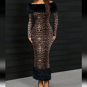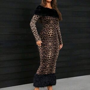 Sexy Leopard Print Patchwork Fluffy Warm Long Dress For Women, Autumn