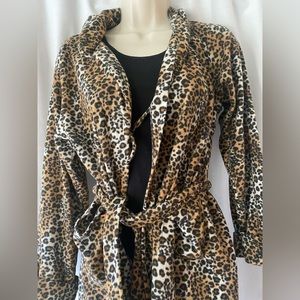 Comfy and sexy thin fleece robe. Leopard is always in style. Size medium. Depending on your height it will come to your hip or mid-thigh.