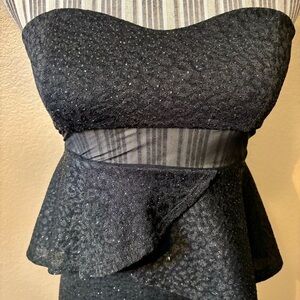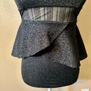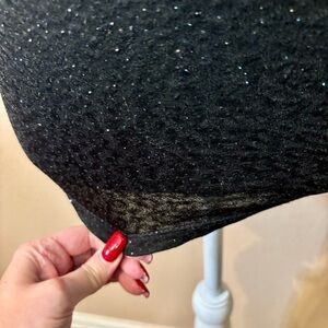 Black Bodycon Dress with Sparkly, Stretchy Material and a Mesh panel below the chest.