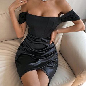 Sexy Off Shoulder Ruched Tulip Hem Mini Dress black