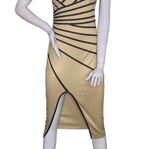Sexy One Shoulder Bandage Dress Size Large Beige and Black Patchwork Front Slit