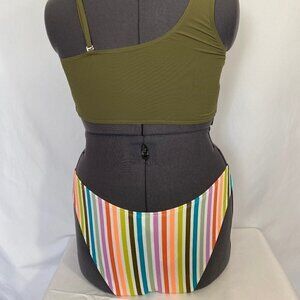 Sexy one shoulder bikini. The top is a olive green with a rainbow bottom. Beach, swim, summer, cute, sexy, swim wear, beach wear, bathing suit, swim suit, green, olive green, rainbow, one shoulder. NWOT...see photos for care details...062821
